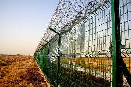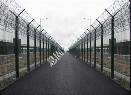 注:如果在飛機場圍欄頂部加裝刀片刺絲、刀片刺繩后又很好的增強了安全防護性能。采用電鍍、熱鍍、噴塑、浸塑等防腐形式,具有很好的抗老化、抗曬、耐候等特點。其產品造型美觀、花色多樣,既起到圍欄作用,又起到美化作用。由于具有安全性高、防攀爬能力好,網(wǎng)片連接方式采用特制SBS緊扣件,有效防止人為的破壞性拆卸,橫向四道折彎加強筋,使網(wǎng)面強度顯著增加。