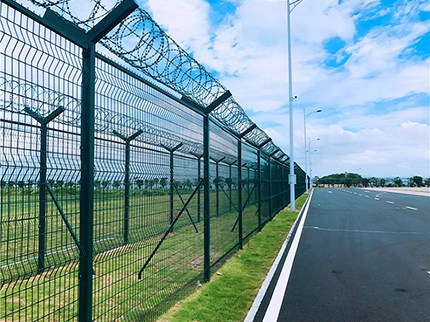 飛行區(qū)鋼筋網(wǎng)圍界網(wǎng)面是由直徑5mm的鋼筋排列成矩形網(wǎng)格點(diǎn)焊形成,相鄰橫筋間距不大于10cm,相鄰豎筋間距不大于5cm.每片鋼筋網(wǎng)片寬度不大于3m,用螺栓固定在事先埋設(shè)好的立柱上.為增加圍界的穩(wěn)定性,一般每30m左右增加一個斜撐.圍界上部50—60cm以30.一45.角向外傾斜,或設(shè)置滾筒形刺鐵絲網(wǎng)防止攀越。